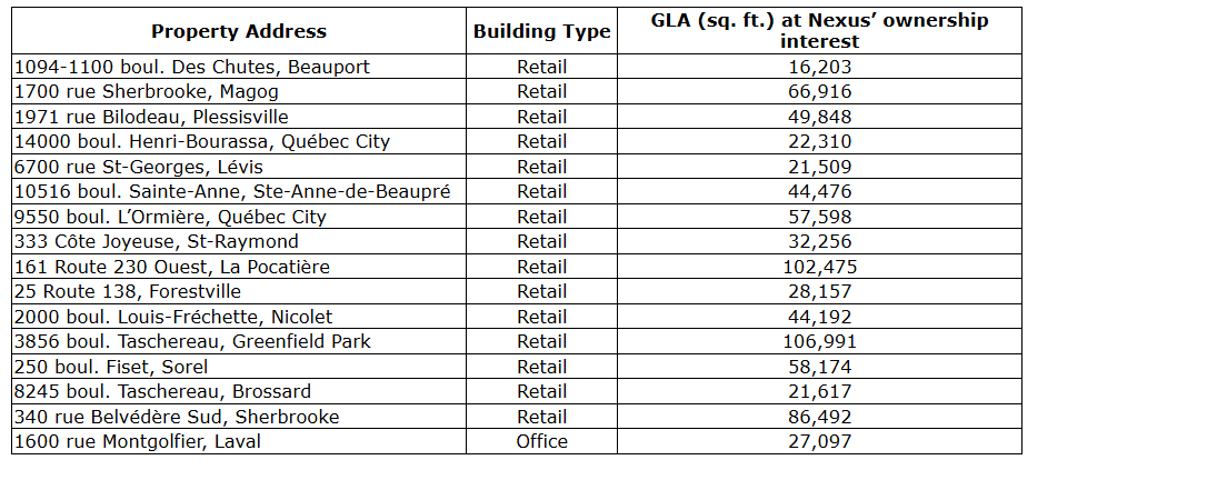 Nexus is a growth-oriented real estate investment trust focused on increasing unitholder value through the acquisition of industrial properties located in primary and secondary markets in Canada and the ownership and management of its portfolio of properties. The REIT currently owns a portfolio of 90 properties comprising approximately 11.7 million square feet of gross leasable area.