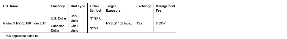 Global X Investments Canada Inc. has launched the Global X NYSE 100 Index ETF. Units of the ETF (exchange-traded fund) will begin trading today on the Toronto Stock Exchange under the ticker symbol NYSX.U.