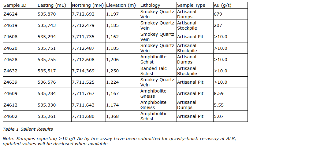 - Selective grab samples returned grades up to 679 grams per tonne Au (sample Z4624) and 207 g/t Au (sample Z4619); five additional samples returned greater than 10 g/t Au by fire assay and have been submitted for gravity-finish reassay;