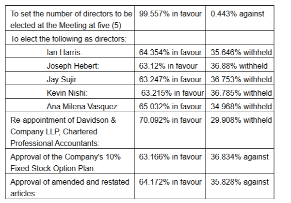 Shareholders also adopted the other resolutions submitted for their approval, as disclosed in the circular, including the reappointment of Davidson & Co. LLP as the auditor of the company, the ratification of the amended and restated articles of the company, and the ratification of the amended and restated 10 per cent fixed incentive stock option plan.