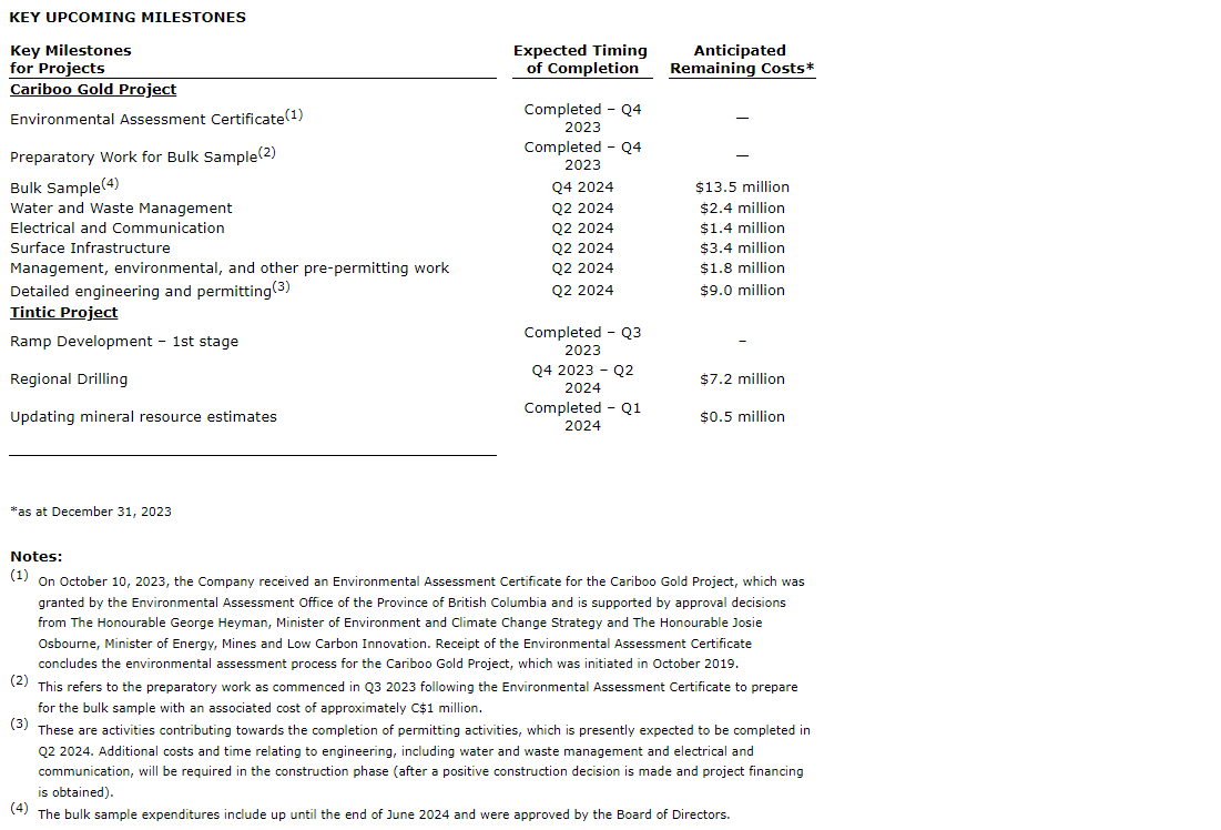 - 468 ounces of gold sold from the Cariboo gold project by processing stockpiles at a third party processing facility (3,272 ounces of gold sold in 2023);