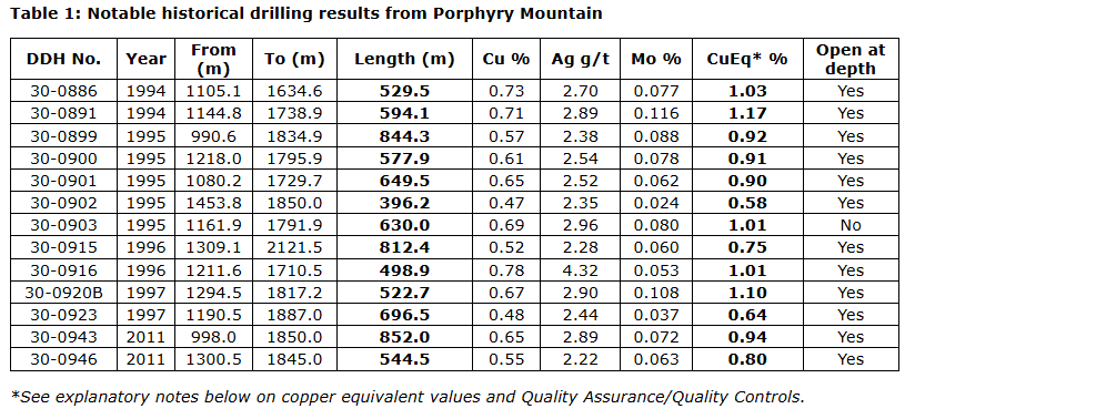 0.70 per cent Cu, 2.92 g/t Ag (silver) and 0.062 per cent Mo (0.95 per cent CuEq (copper equivalent)) from 998.0 to 1850.0 metres, which confirms previously obtained historical results (see Table 1). Many of the historical holes drilled by previous operators that reached the lower portion of the Porphyry Mountain deposit were stopped in mineralization (see Table 1), demonstrating that the deposit remains open at depth.