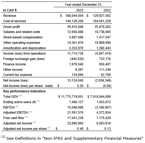 Payfare achieved its full-year 2023 revenue and adjusted EBITDA guidance based on unaudited financial results for the year ended 2023: