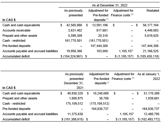 In connection with finalizing the unaudited 2023 consolidated financial statements, the company identified an error associated with the classification of cash and cash equivalents with reference to international accounting standard 7 (Statement of Cash Flows) and an agenda decision issued in March, 2022, by the international financial reporting standard interpretation committee, which provided clarification on the interpretation of the standard, which was finalized in March, 2022. This resulted in the majority of the balance previously classified as cash -- restricted -- to be reclassified to prefinanced deposits. In addition, certain balances that were previously presented as cash -- restricted -- now meet the definition of cash equivalents as the funds are liquid in nature with short-term withdrawal restrictions. As a result, these amounts were reclassified from cash -- restricted -- to cash and cash equivalents, accounts receivable, prepaid and other assets, and accounts payable and accrued liabilities. The correction had no impact on the consolidated statement of operations and comprehensive income (loss) for the year ended Dec. 31, 2022.