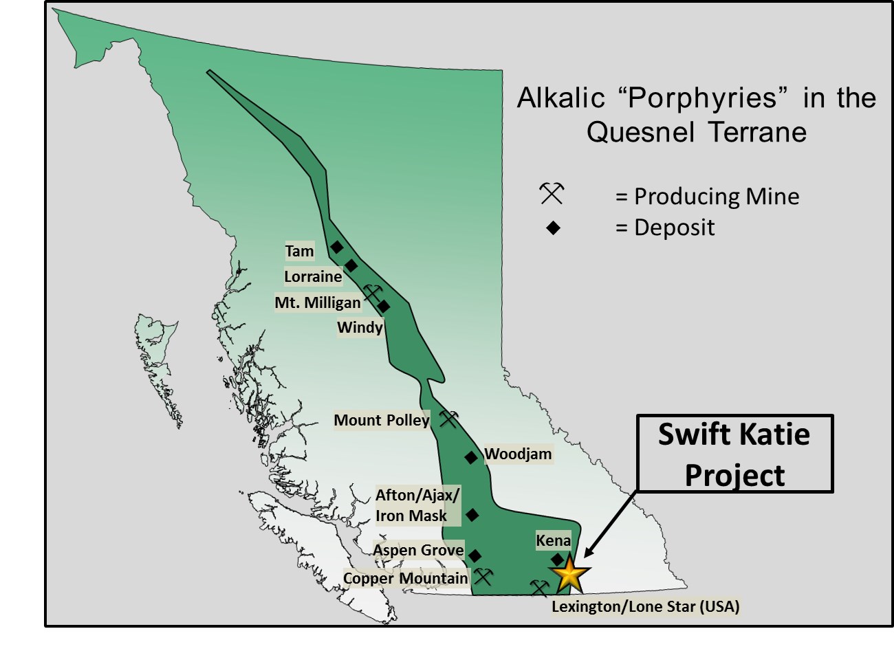 The Swift-Katie project is located 7 kilometers southwest of Salmo, British Columbia, Canada, has excellent access via road and infrastructure, and benefits from a year-round exploration advantage. The large land package consists of 19 MTO and Legacy mineral claims totaling approximately 8,797 hectares, which comprises two claim groups underlying the Katie copper-gold-silver porphyry deposit (a possible analogue to the producing Copper Mountain Mine at Princeton, BC) and the Swift gold target (possible analogues to gold-veins in the nearby Rossland Mining District) (+2.7Mozs Au production).