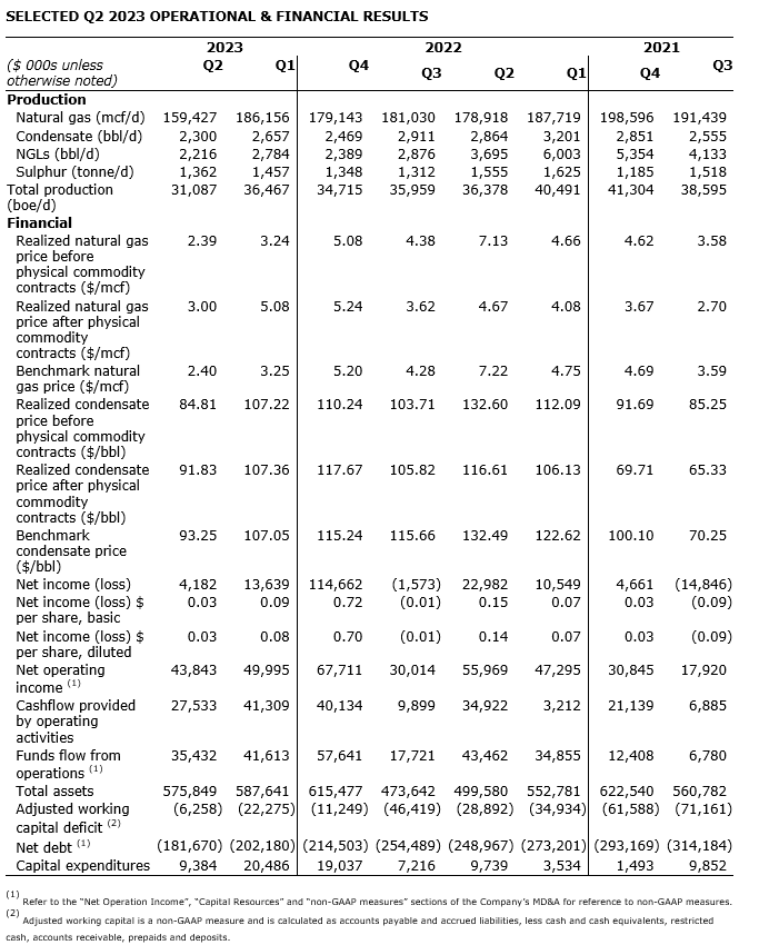 • Produced 31,087 barrels of oil equivalent per day (boe/d) (85 per cent natural gas), versus 36,378 boe/d in Q2 2022;