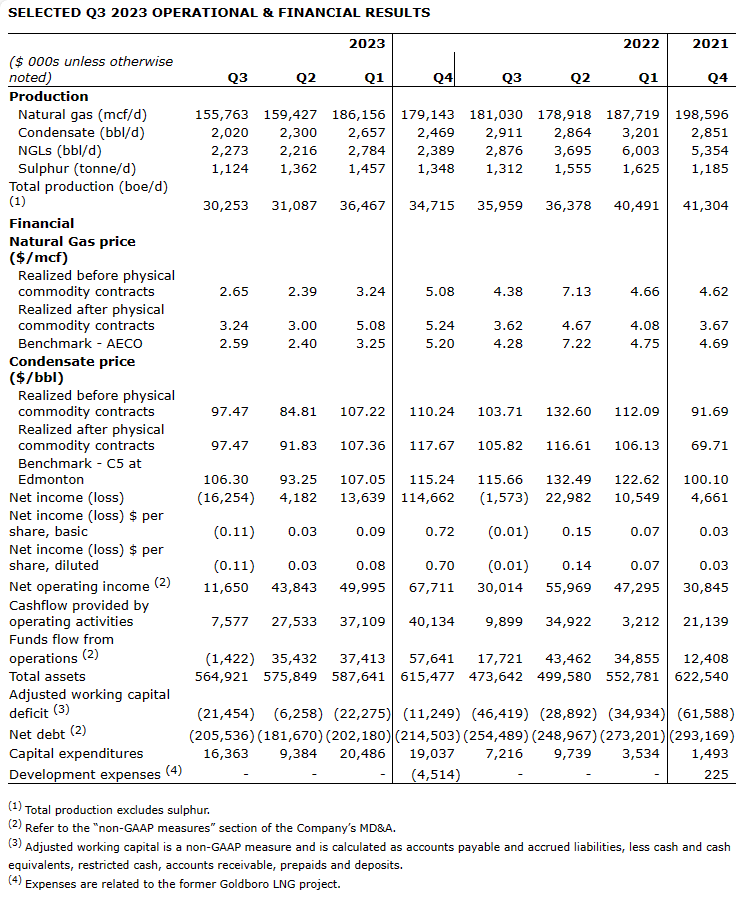 Natural gas pricing continued to be lower than in comparative periods with AECO natural gas down 39% compared to Q3 2022, driven by high storage levels and seasonally weak demand.