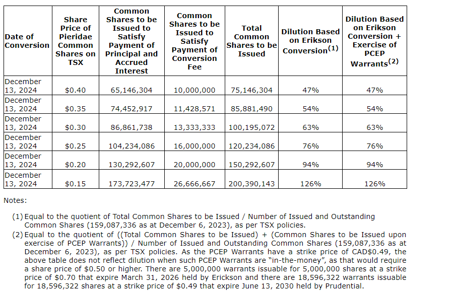 conversion amount), inclusive of accrued interest and conversion fee. The number of common shares required to be issued to satisfy the payment in full of the maximum conversion amount, at the expiration of the bridge term loan, should a notice of conversion be issued by Erikson or the corporation at such time, depends on the five-day volume weighted average price of the common shares (the conversion price) at the time the notice of conversion is issued. Thus, based on a sensitivity analysis reflecting a range of conversion prices from 40 cents to a low of 15 cents, the corporation has obtained shareholder approval to issue the number of common shares required to repay, in full, the maximum conversion amount of the bridge term loan on Dec. 13, 2024, such maximum conversion amount comprised the sum of (i) the principal amount of $20-million, (ii) accrued interest thereon of $6-million and (iii) the conversion fee of $4-million. For illustrative purposes only, attached is a table that sets forth the number of common shares that would be needed to settle the maximum conversion amount based on a range of volume weighted average prices of the corporation's common shares.