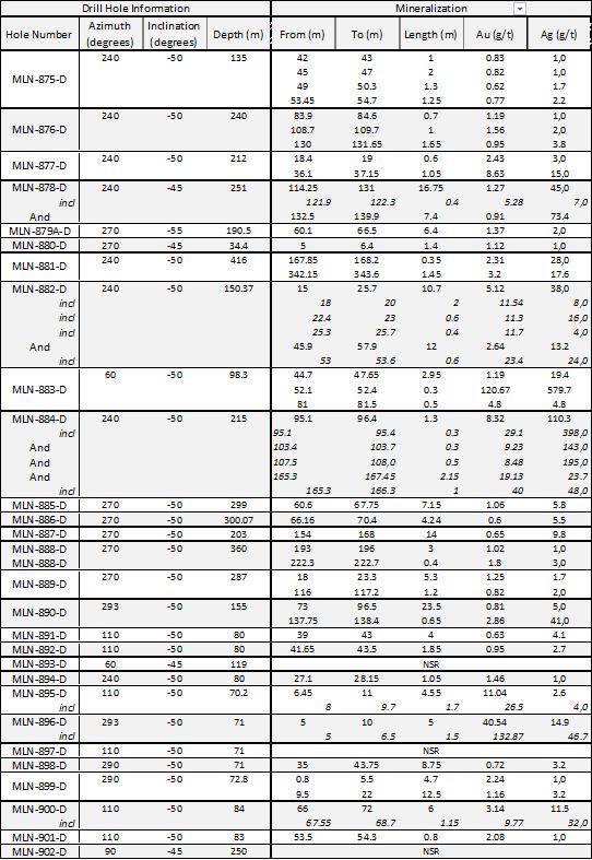 • Gold ("Au") values up to 132.9 g/t and silver ("Ag") values up to 46.7 g/t, within 5 meters grading 45.5 g/t Au and 14 g/t Ag, were reported in samples from core hole MLN-896-D.