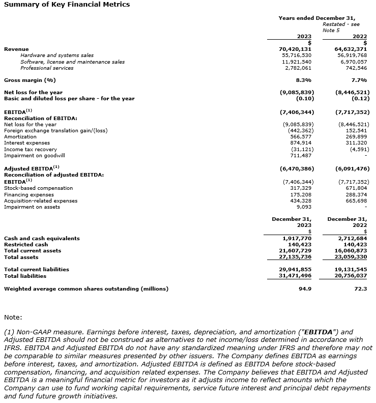 - High-margin software sales and professional services for the year ended Dec. 31, 2023, increased by 165 per cent and 241 per cent, respectively, year over year, totalling $3.8-million in revenue.