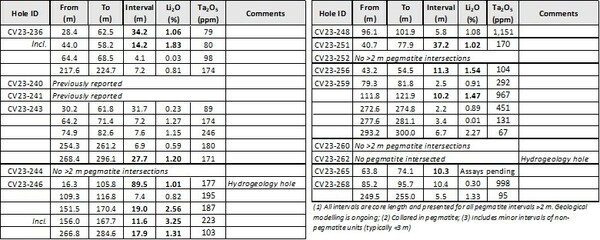 • 27.7 m at 1.20 per cent Li2O and 7.2 m at 1.27 per cent Li2O (CV23-243);