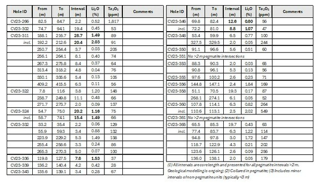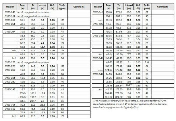 • 99.9 m at 0.39 per cent Li2O, including 30.6 m at 0.80 per cent Li2O (CV23-345);