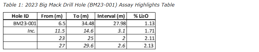 Drill hole BM23-001 was testing the interior section of the Big Mack pegmatite and returned assay values of 1.13 per cent Li2O (lithium oxide) over 27.98 m (see the table entitled "2023 Big Mack drill hole (BM23-001) assay highlights table"), confirming previous exploration conducted on the Big Mack pegmatite which indicated that concentrations of lithium mineralization were present in this area. The company plans to drill approximately 5,000 metres as part of the current exploration program, which is designed to delineate the Big Mack and Elven zone pegmatites, test the down-dip extensions of these pegmatites, and explore the Sprinkler zone and other exploration targets identified from the geophysics and surface sampling program undertaken by the company in the summer of 2023. Over 3,300 metres across 28 collar locations having been drilled to date, with 601 samples having been submitted for analysis at the time of this news release.