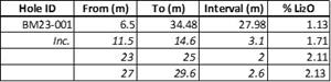 2023 Big Mack Drill Hole (BM23-001) Assay Highlights Table