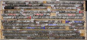 Core photo of hole BM23-001 (17.25m to 34.48m) highlighting Li2O% values in high grade intercepts from 23 -25 m (red) and 27 – 29.6 m (blue).