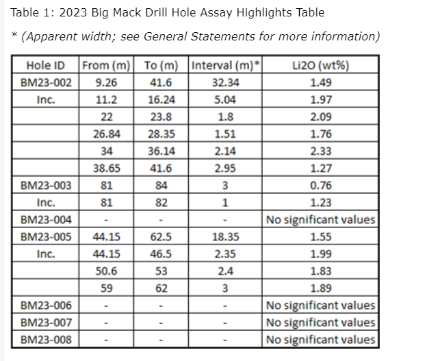 - 1.97 per cent lithium oxide (Li2O) over 5.04 metres and 2.33 per cent Li2O over 2.14 metres within the interior of the Big Mack pegmatite of 1.49 per cent Li2O over 32.34 metres (BM23-002);
