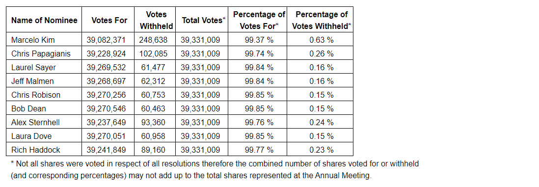 A total of 44,110,668 common shares were represented at the annual meeting, or 69.91 per cent of the votes attached to all outstanding shares at the company's record date of March 28, 2023. The company's shareholders voted for the election of all director nominees listed in the company's management information proxy circular. Detailed results of the vote for the election of directors are provided in an attached table.