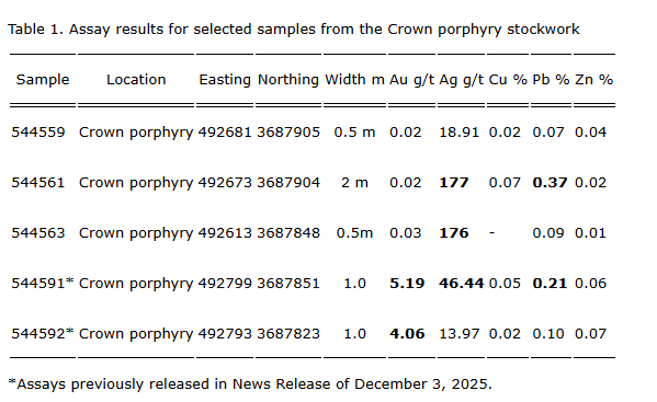 Overlimit silver assays have been received for the samples taken in late 2025, showing high-grade silver mineralization associated with quartz-sulphide veins hosted by the Crown porphyry (Table 1). These assays provide evidence for a high-priority drill target, especially when taken in conjunction with the high gold assays reported previously for the stockwork intrusion (see the news release dated Dec. 3, 2025).