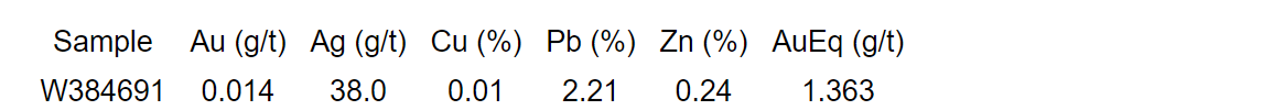 19.90 g/t Au, 180.0 g/t Ag and 3.39 per cent Cu (W384813);