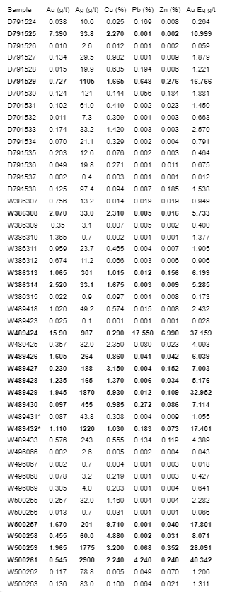 15.90 grams per tonne Au, 987 g/t Ag, 0.29 per cent Cu, 17.55 per cent Pb and 6.99 per cent Zn (W489424);
