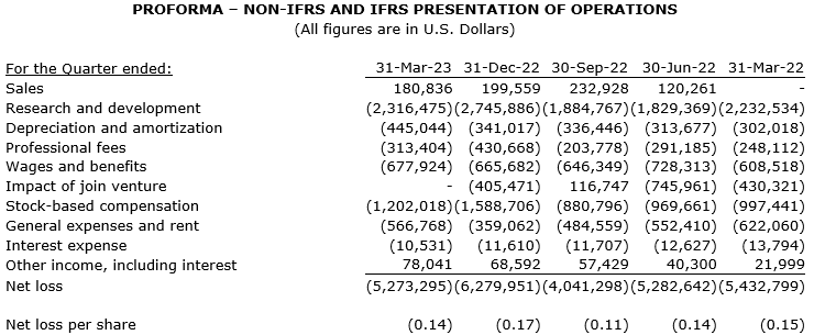 The company reported a net loss of $5.3-million, or 14 cents per share, in the first quarter of 2023 compared with a net loss $5.4-million, or 15 cents per share, for the same period in 2022 and a net loss of $6.3-million, or 17 cents per share, in the fourth quarter of 2022. The net loss in the first quarter of 2023 included research and development costs of $2.3-million compared with $2.2-million for the same period in 2022 and $2.7-million in the fourth quarter of 2022. Fluctuations in R&D for a company of this size and this stage of growth are expected on a period-over-period basis as the company transitions from technology development to product development.