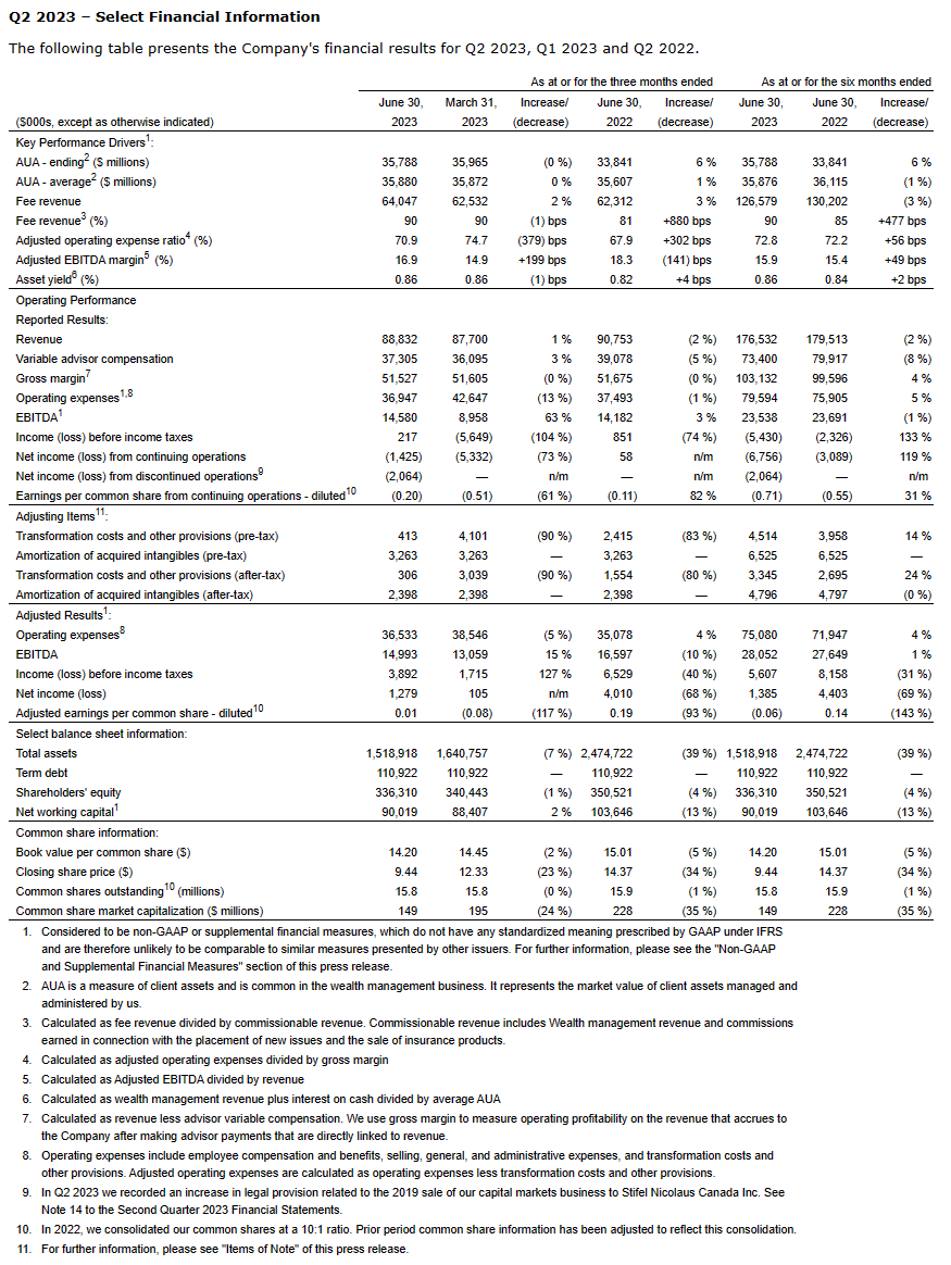Kish Kapoor, President, and Chief Executive Officer, commented, "Our transformation work has strengthened our platform, generated interest in our story, and reduced the risk in our business. It has made our business more profitable and valuable than when we started our journey in 2020. While the share price is not yet aligned, we expect the improving fundamentals of our business will translate into meaningful long-term shareholder value and the share price to follow. With transformation work complete, our story now centers around growth, both within our advisors' practices and through acquisition."