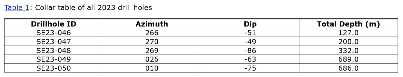 Summary of SE23-049 & SE23-050 (assays pending)Drillhole SE23-049 intersected the Upper Chinchilla Zone horizon over a roughly 9 m thick interval at depths consistent with nearby drillhole SE21-024 (Figure 2).2.7m of total core loss was encountered in the middle of the aforementioned 9 m interval which is interpreted as a collapse breccia zone or cave resulting in no core recovery.Drilling beneath the upper zone intersected multiple stacked zones of CRD style alteration ranging from 1-5m thickness extending down to 665 meters downhole. (see core photo in Picture 1)Picture 1: Core photos of CRD alteration and corresponding shortwave UV "BBQ Rock" at depth in SE23-049. Tracking of fugitive calcite is a proven vectoring technique and indicator of proximity to a CRD systemTo view an enhanced version of this graphic, please visit:https://images.newsfilecorp.com/files/7298/188360_8677844b5489584a_002full.jpgDrillhole SE23-050 intersected the Upper Chinchilla Zone horizon over a roughly 25 m thick interval at depths consistent with nearby drillholes SE21-025 and SE22-045 (Picture 2 & Figure 2).Drilling beneath the Upper Chinchilla Zone intersected intervals of CRD style alteration ranging from 1-3m thickness down to 400 meters downhole as well as UV fluorescing "BBQ Rock" (fugitive calcite) vein breccia intervals down to 600m depth. (see core photo in Picture 3)Picture 2: Representative core and shortwave UV photo of the Upper Chinchilla Zone SE23-050. Note the lack of "BBQ Rock" fugitive calcite veins, which typically occur on the margins of the CRD systemTo view an enhanced version of this graphic, please visit:https://images.newsfilecorp.com/files/7298/188360_8677844b5489584a_003full.jpgPicture 3: Core and Shortwave UV photo of "BBQ Rock" (fugitive calcite veins) at depth in SE23-050.To view an enhanced version of this graphic, please visit:https://images.newsfilecorp.com/files/7298/188360_8677844b5489584a_004full.jpg