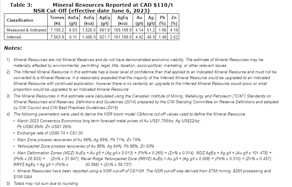 - High-grade underground mine with mineralized material averaging $361/t net smelter return value (diluted) comprising Main zone with 11.43 million tonnes (Mt) averaging 3.80 grams per tonne gold, 37.37 g/t silver, 2.34 per cent zinc, 1.30 per cent lead (diluted) and Yellowjacket zone 340,000 tonnes averaging 8.61 per cent Zn, 2.66 per cent Pb, 65 g/t Ag and 0.07 g/t Au (diluted);