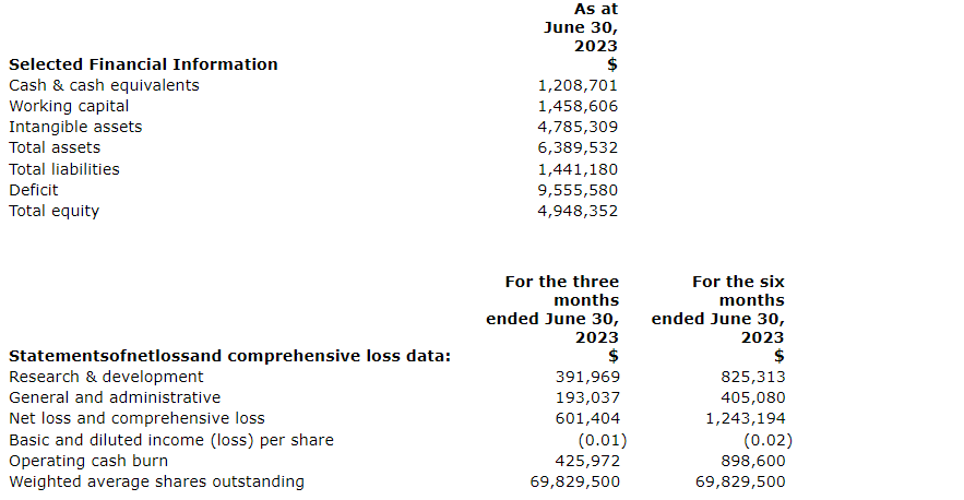 For the three and six months ended June 30, 2023, the company reported a net loss of $601,404 and $1,243,194, respectively. Research and development expenses were $391,969 and $825,313 for the three and six months ended June 30, 2023, respectively. General and administrative expenses were $193,037 and $405,080 for the three and six months ended June 30, 2023, respectively. Total cash expenses related to research and development and general and administrative expenses for the three months ended June 30, 2023, were $425,972.