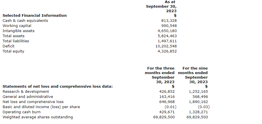 For the three and nine months ended Sept. 30, 2023, the company reported a net loss of $646,968 and $1,890,162, respectively. Research and development expenses were $426,852 and $1,252,165 for the three and nine months ended Sept. 30, 2023, respectively. General and administrative expenses were $163,416 and $568,496 for the three and nine months ended Sept. 30, 2023, respectively. Total cash expenses related to research and development and general and administrative expenses for the three months ended Sept. 30, 2023 were $429,671.