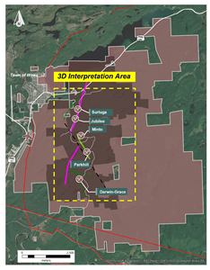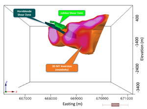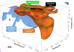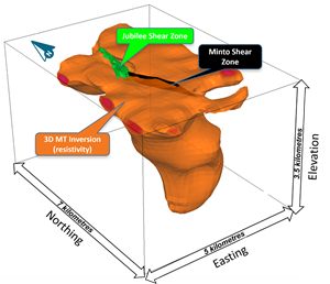 In 2017 a three-dimensional inversion of the phase-tensor, tipper and horizontal magnetic transfer function was performed and recently the results have been further refined and interpreted. The 3D inversion clearly shows that the Jubilee Stock is a large intrusive complex that is now known to host an intrusion-related gold system. This interpretation is supported by inversions of not only the Mt survey, but airborne time domain electromagnetics (EM) (VTEM), airborne magnetics (Hogg), drilling results, geochemistry, and surface mapping. Historical work from the OGS indicate that the Jubilee Stock is a shallow-level subvolcanic intrusion (Ontario Geological Survey Open File Report 5586), a critical ingredient for the formation of intrusion-related gold mineralization.