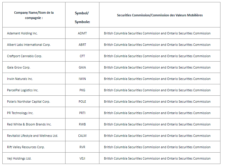 Effective immediately, the companies named in the attached table have been suspended pursuant to Canadian Securities Exchange Policy 3. The suspensions are considered regulatory halts as defined in National Instrument 23-101 trading rules. Cease trade orders have been issued by one or more securities commissions.