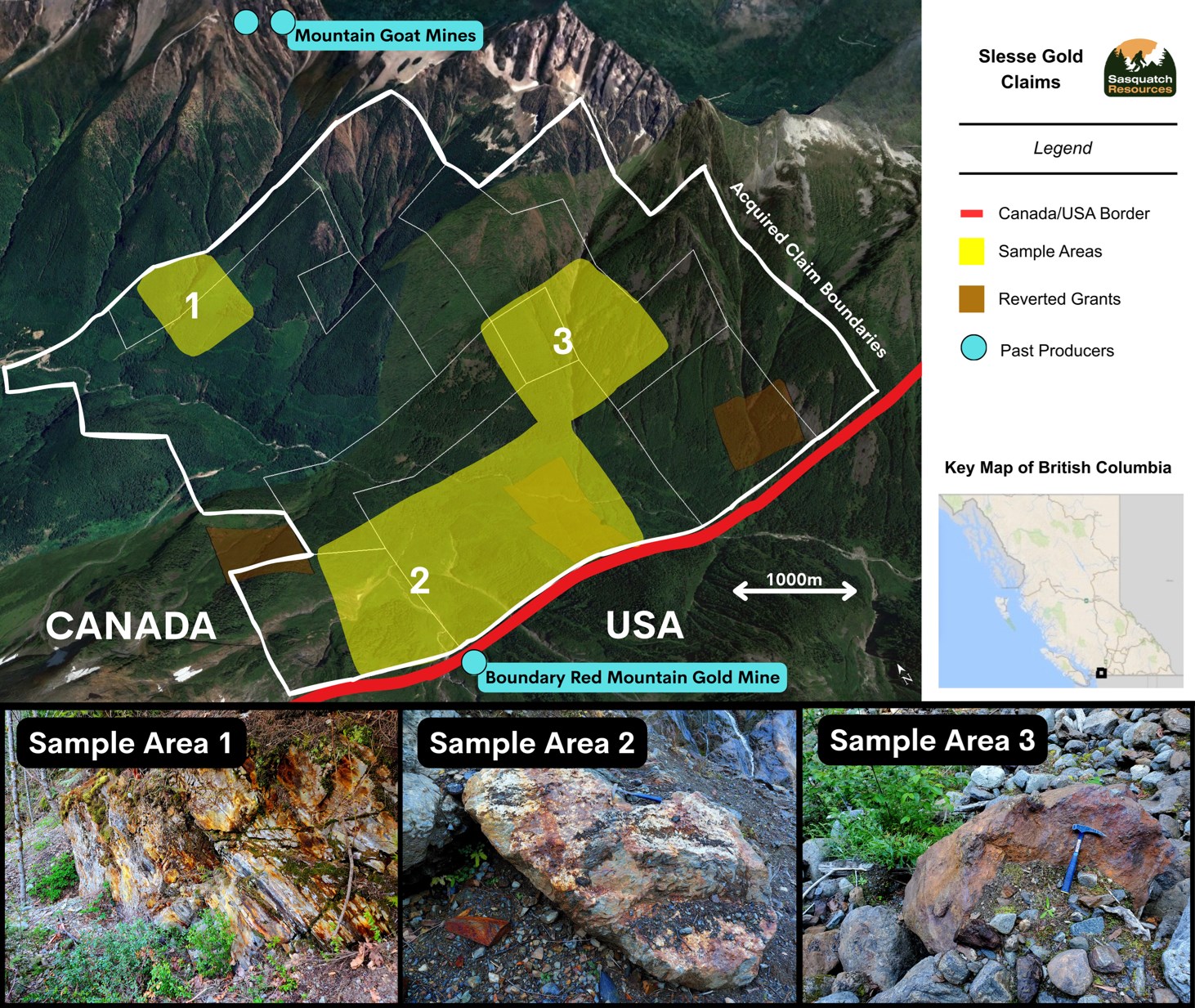 Sasquatch's CEO, Pete Smith, said "In early November, Sasquatch sponsored an expedition into what is known as the Slesse Gold Claims area, which carries straight through to the USA border and, at its southern end, is within 150 meters of the Boundary Red Mountain Gold Mine. Although the area was previously accessible using an old logging/mining road, this road has been overgrown and now must be navigated by foot, thus requiring at least an overnight trip in to properly evaluate. Due to the remote location, the area has not, as far as we know, been thoroughly investigated from the Canadian side, but we are confident that rehabilitation of the old road is an option if warranted. Upon returning, prospectors led by Sasquatch director Justin Devault reported extensive apparent mineralization, including thousands of large float boulders, large outcrops, and extensive quartz veins. We've taken a number of samples and we look forward to reporting results once received. In addition, Sasquatch has applied to extend the claim area north to encompass the old Mountain Goat Mines. These historic mines appear to contain a number of large waste piles that are of particular interest to the Company. Given that mining occurred over 100 years ago, our hope is that the waste may still contain high levels of gold and/or other precious minerals. In addition, historic exploration from the Mountain Goat Mines area, as reported on Minfile, suggests there are gold-bearing quartz veins of considerable grade."