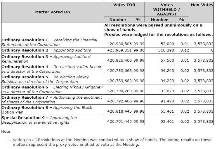 Silver Bear Resources PLC has released the voting results of its annual general and special meeting held today in Moscow, Russia. A total of 424,457,739 ordinary shares were voted in connection with the meeting, representing approximately 62.57 per cent of the issued and outstanding ordinary shares of the company eligible to vote at the meeting. The results of all matters considered at the meeting are reported in the report of voting results as filed by the company on SEDAR+.