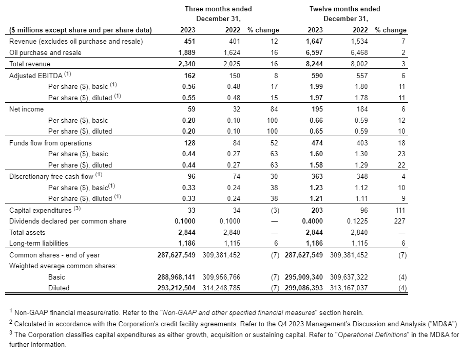 • Generated revenue (excluding oil purchase and resale) of $1.647-billion, an increase of 7 per cent from 2022.