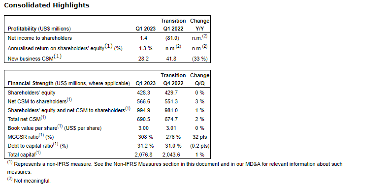 - Q1 2023 CSM to shareholders of approximately $1.1-billion to $1.3-billion, resulting in shareholders' equity and CSM to shareholders capital of approximately $1.8-billion to $2.0-billion;