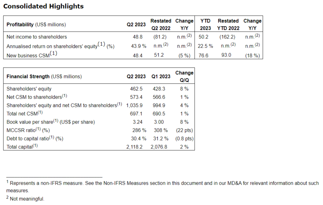 - Total net CSM(1) was $243.1 million which was stable Q/Q due to new business CSM(1) of $8.3 million during the quarter which was mostly offset by amortization of CSM into profit.