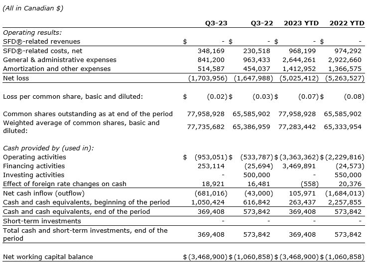 Summary highlights of NXT Energy's third quarter 2023 financial statements (with comparative figures to 2022) are noted herein. All selected and referenced financial information noted should be read in conjunction with the company's third quarter 2023 unaudited condensed consolidated interim financial statements and the related management's discussion and analysis.