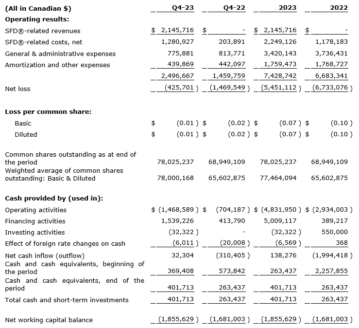 - A net loss of approximately $5.45-million was recorded for year-end 2023, including SBCE and amortization expense of approximately $1.97-million.