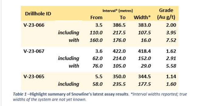 Hole V-23-066 is collared in coarse-grained granodiorite within the Valley intrusion roughly 48 m northwest of the nearest hole, V-22-007 (410 m at 1.89 g/t Au from surface, including 3.24 g/t Au over 146 m Au starting at 56 m depth, see Snowline news release dated Nov. 15, 2022) and 58 m southeast of V-23-037 (383.8 m at 2.47 g/t Au, including 120 m at 4.06 g/t Au from surface, see Snowline news release dated Aug. 3, 2023).