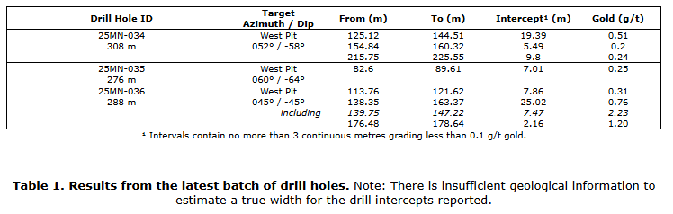 - 25MN-040: drilled as a 50-metre stepout on hole 25MN-038, to the east-northeast, in a structurally complex area to the south of the historic West pit.
