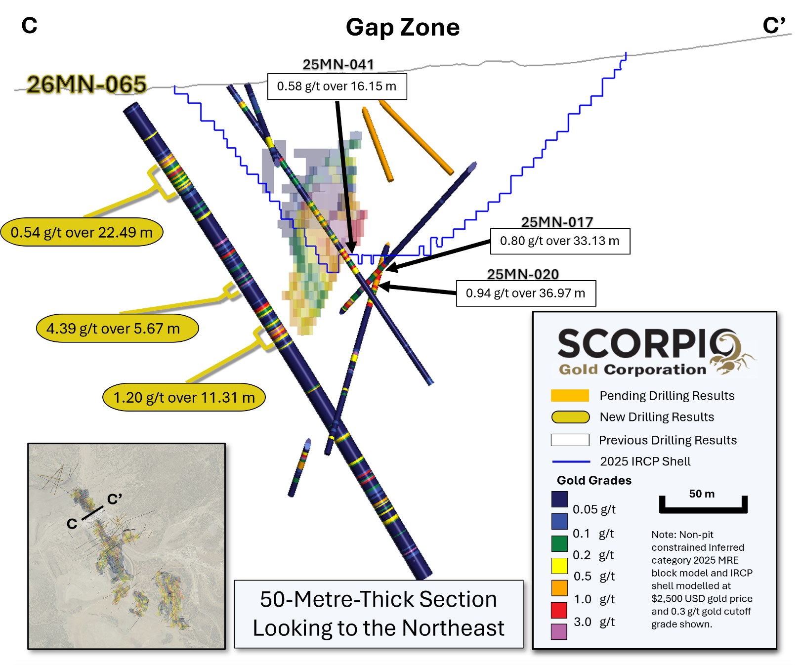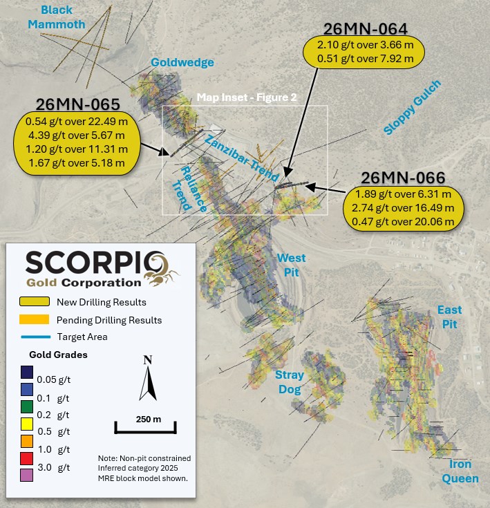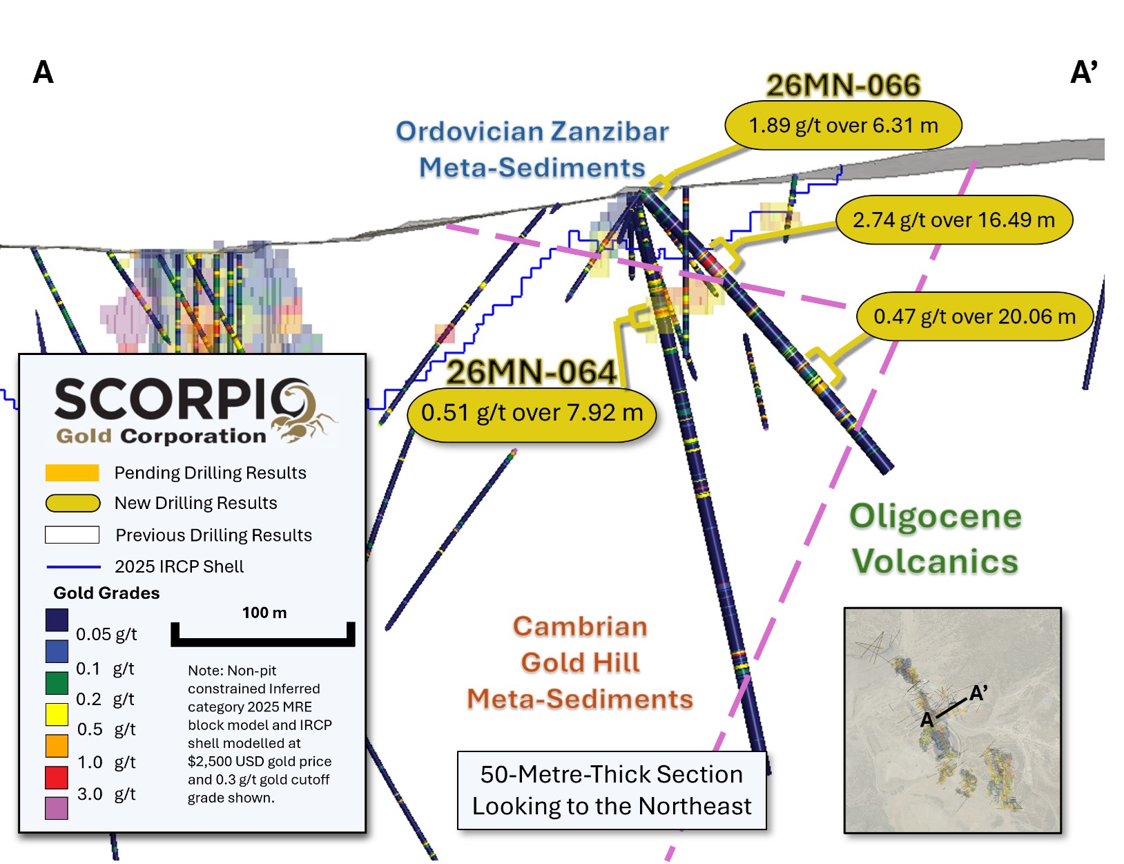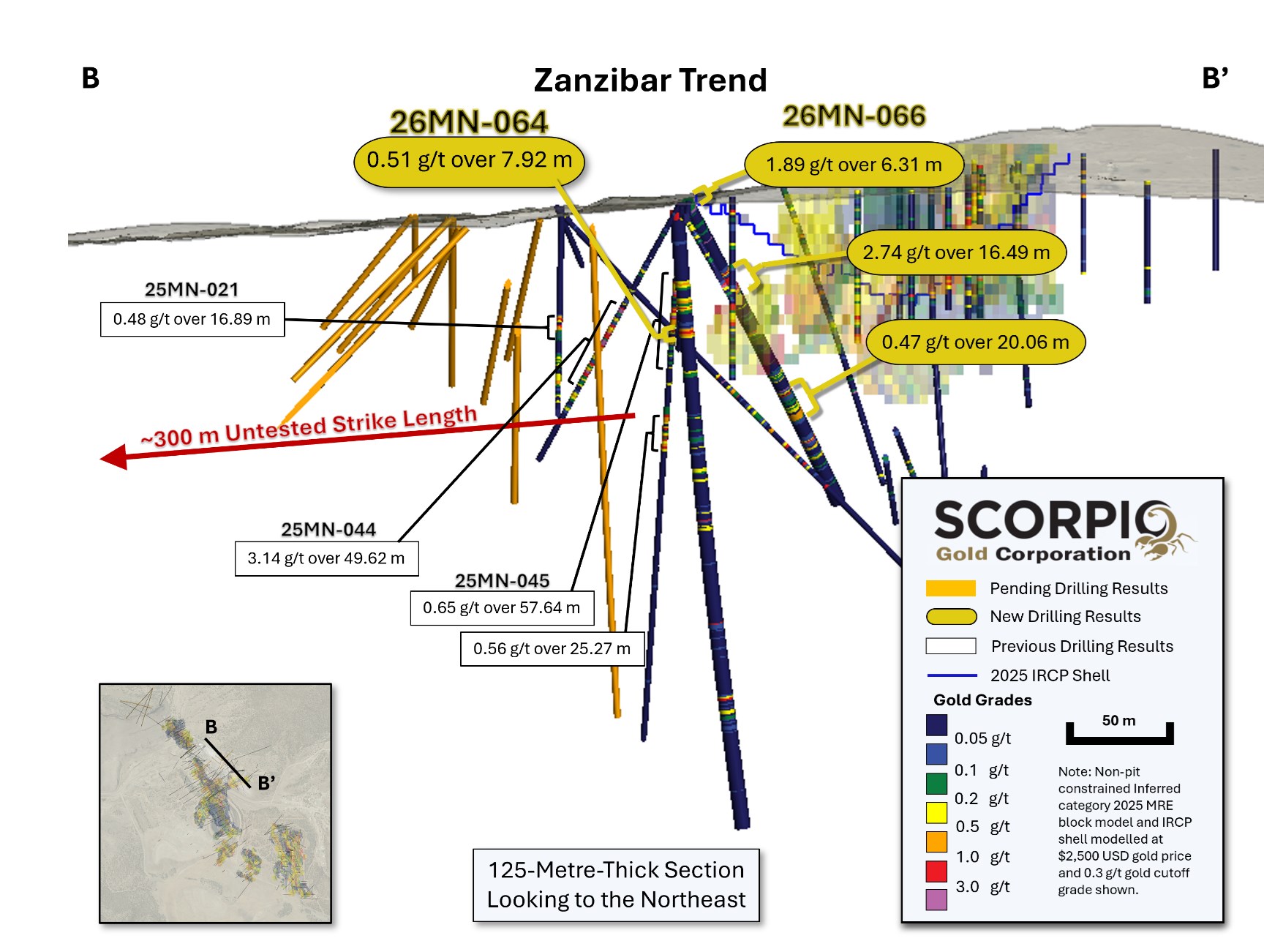 Drill holes 26MN-064 and 26MN-066 were drilled along the Zanzibar Trend as approximately 50 m step-outs at depth and to the east of hole 26MN-063, see news release dated April 16, 2026, see Figure 2. Drill hole 26MN-065 is a 50 m step-out to the north, within the Gap Zone, to hole 25MN-041, see news release dated February 11, 2026. All the drill holes tested beyond the Inferred Resource Constraining Pit ("IRCP"), see Figures 4 through 6. Step-out drill holes targeted uncategorized mineralization in the 2025 MRE block model. For further details see "Mineral Resource Estimate and NI 43-101 Technical Report, Manhattan Property, Nye County, Nevada" with an effective date of June 4, 2025, on Scorpio Gold's website at https://wp-scorpiogold-2025.s3.ca-central-1.amazonaws.com/media/2025/10/Scorpio-Gold-Manhattan-Mineral-Resource-Estimate-43-101-FINAL-2025-10-23.pdf.