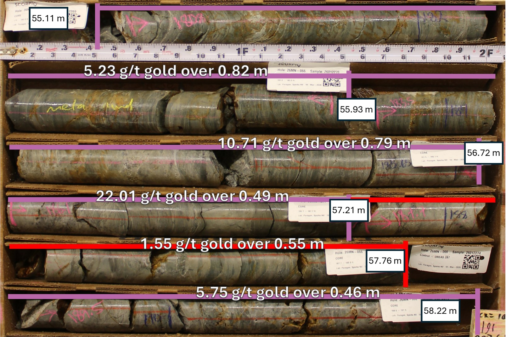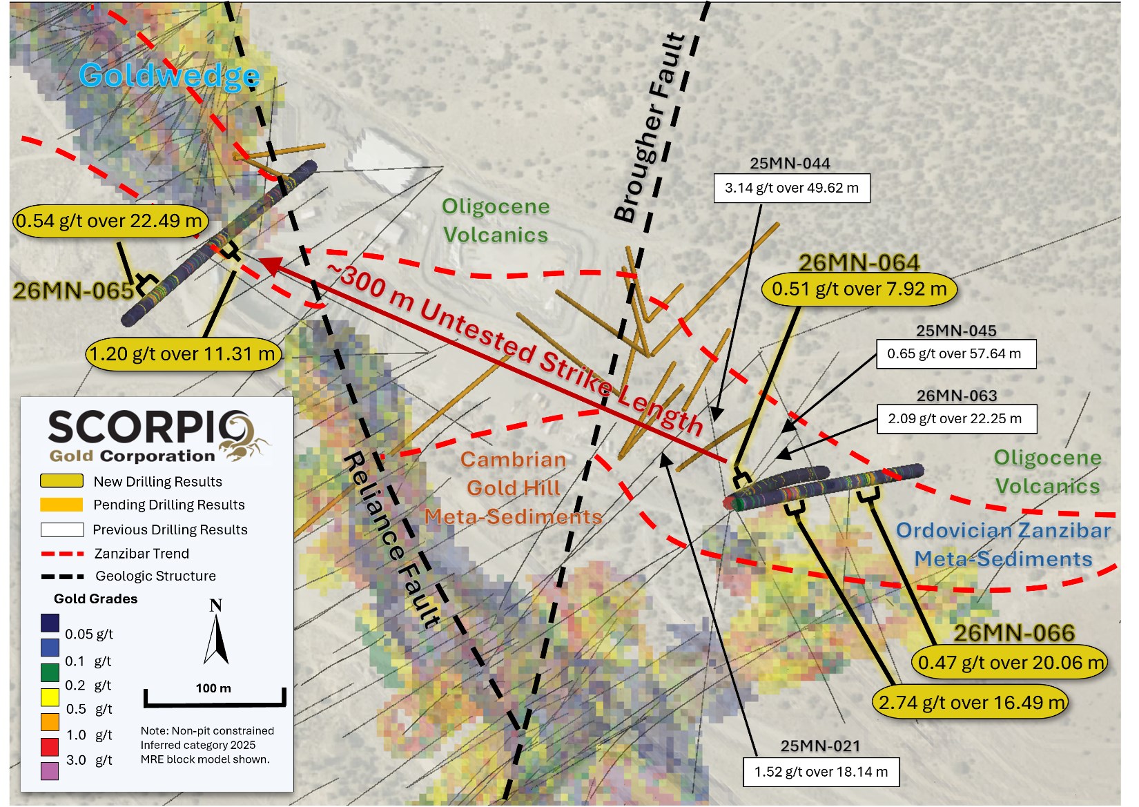 "These results continue to strengthen our understanding of the geologic controls underpinning mineralization along the Zanzibar Trend and its relationship to the broader Reliance corridor. With each successive hole, we are building a more cohesive interpretation of the system, and there is a growing belief that the same combination of lithology and structure that controls mineralization along the Zanzibar Trend may extend northwest through Goldwedge and potentially towards Black Mammoth. Additionally, the same prospective lithologic units are found at the historic April Fool target which lies along strike of the developing Zanzibar Trend to the southeast, defining a much larger potentially mineralized corridor than previously recognized. Hole 26MN-066 delivered a standout intercept of 2.74 g/t gold over 16.49 metres from 45.45 metres, proximally downhole from an additional 1.89 g/t gold over 6.31 metres from surface, confirming the strength of mineralization along this emerging trend. Together with hole 26MN-064, these 50-metre step-outs are establishing meaningful continuity along the greater than 300-metre, largely untested strike corridor identified earlier this year. The grade tenor and emerging structural continuity we are seeing are particularly encouraging, and we remain optimistic that we are in the process of unlocking a significant new structural corridor adjacent to, and potentially linking with, the main Reliance Trend. With one of our three active rigs continuing to advance the Zanzibar Trend, we look forward to building on these results in the weeks ahead," stated Harrison Pokrandt, VP Exploration of Scorpio Gold.