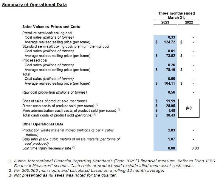 The company recorded an average realized selling price of $104.10 per tonne in the first quarter of 2023 as a result of improved market conditions in China, expansion of its sales network and diversification of its customer base. The product mix for the first quarter of 2023 consisted of approximately 55 per cent of premium semi-soft coking coal, 2 per cent of standard semi-soft coking coal/premium thermal coal and 43 per cent of processed coal.
