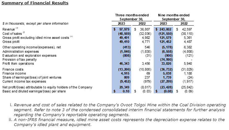 The company's results for the three and nine months ended September 30, 2023 are contained in the unaudited condensed consolidated interim financial statements and Management Discussion and Analysis of Financial Condition and Results of Operations, available on the SEDAR+ website at www.sedarplus.ca and the company's website at www.southgobi.com.