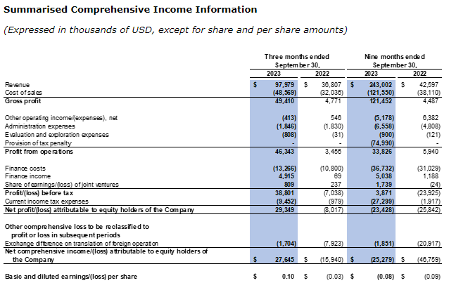The company recorded a $33.8 million profit from operations in the first nine months of 2023 compared to a $5.9 million profit from operations in the first nine months of 2022. The financial results for the first nine months of 2023 was impacted by increased sales volume and improvement in the company's average realised selling price.