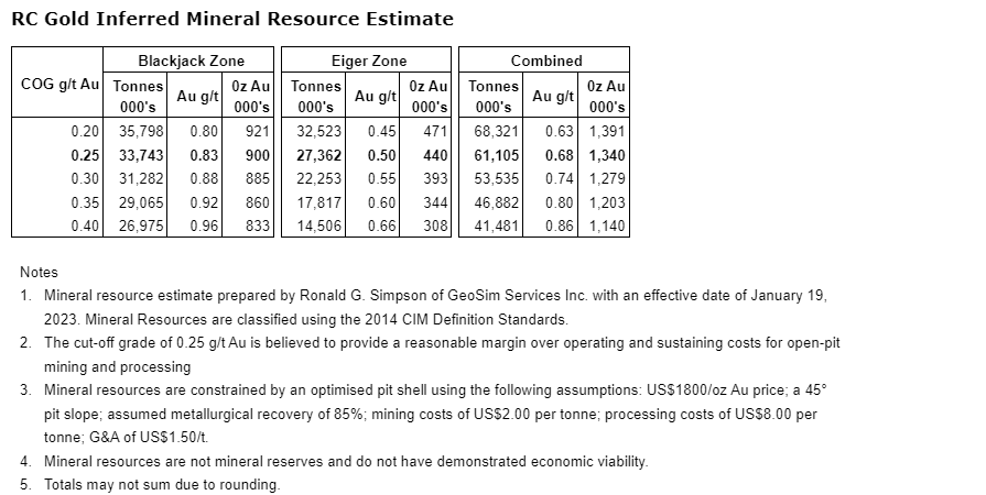 The initial mineral resource estimate of 1.34 million ounces of gold at the RC gold project comprises two deposits: the Blackjack deposit containing 900,000 ounces of gold at a grade of 0.83 g/t gold and the Eiger deposit containing 440,000 ounces of gold at a grade of 0.50 g/t gold (see news release dated Jan. 19, 2023). Both of these deposits are at/near surface, are potentially open-pit minable and amenable to heap leaching, with initial bottle roll tests indicating that the gold is not refractory and has high gold recoveries of up to 94 per cent with minimal sodium cyanide consumption (see news release July 13, 2022).