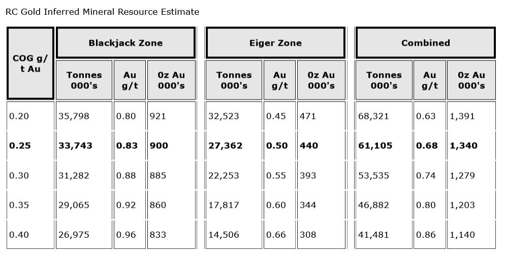 . The road accessible, pit constrained Mineral Resource is classified as inferred and is contained in two near/on-surface zones: The Blackjack and Eiger deposits.