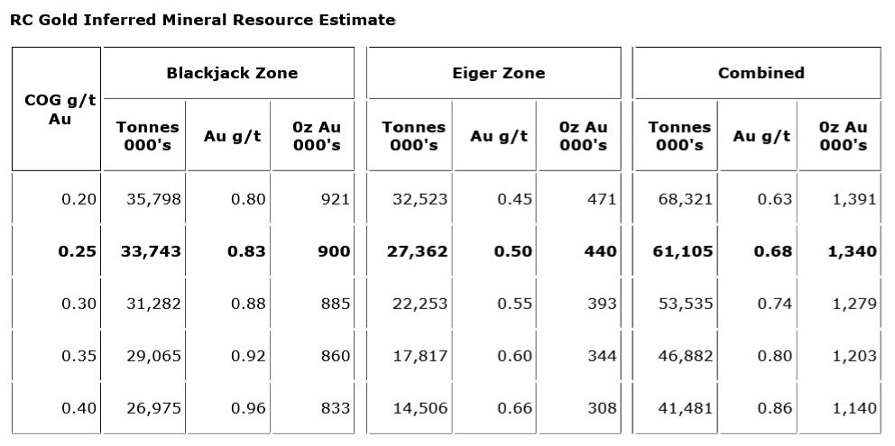 On January 19, 2023 Sitka Gold announced an Initial Mineral Resource Estimate prepared in accordance with National Instrument 43-101 ("NI 43-101") guidelines for the RC Gold Property of 1,340,000 ounces of gold(1). The road accessible, pit constrained Mineral Resource is classified as inferred and is contained in two zones: The Blackjack and Eiger deposits. Both of these deposits are at/near surface, are potentially open pit minable and amenable to heap leaching, with initial bottle roll tests indicating that the gold is not refractory and has high gold recoveries of up to 94% with minimal NaCN consumption (see News Release July 13, 2022). The Mineral Resource estimate is presented in the following table at a base case cut-off grade of 0.25 g/t Au: