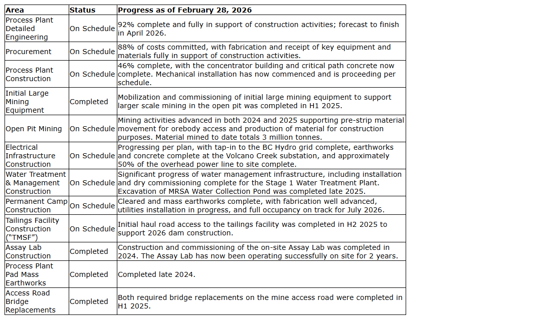 Comprehensive reviews undertaken by the project team, together with independent third party consultants, continue to support the development schedule. In tandem with the updated 2026 construction budget, the project remains on schedule, with initial production targeted for Q2 2027 followed by commercial production in the third quarter.